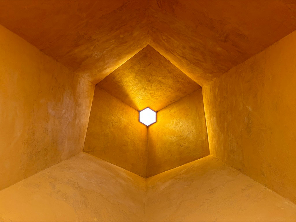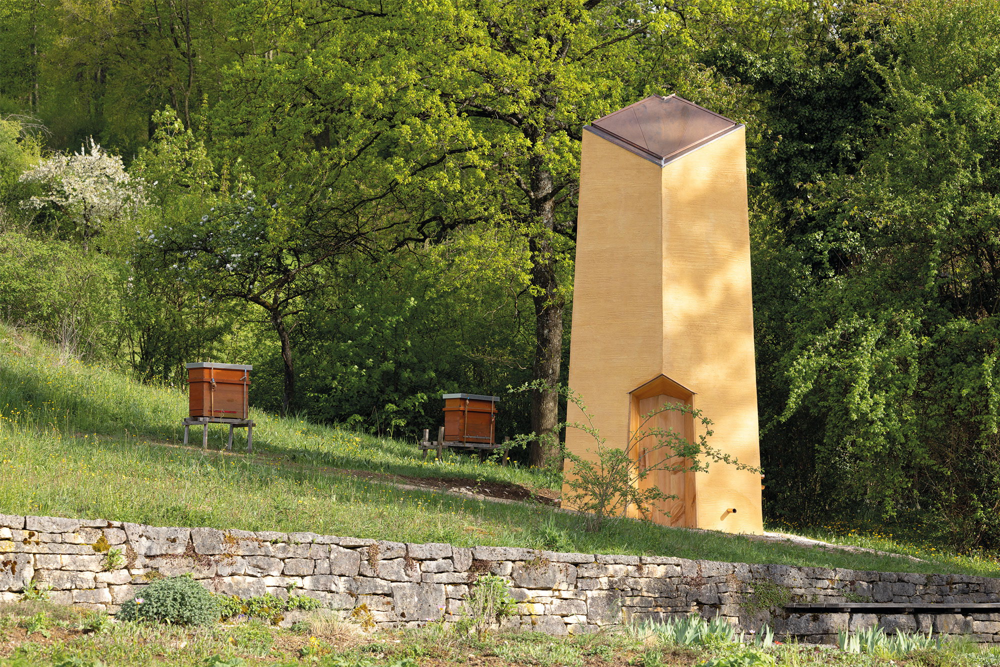 Ein Erlebnisraum als begehbare Skulptur eröffnet sich Besuchenden, um dem Wesen der Bienen zu begegnen. Der Holz-Lehm-Bau ist mit der Hilfe von vielen flessigen Helfer*innen entstanden. Bienenvölker platziert in den Wänden machen den Organismus 'Bienenvolk' mit allen Sinnen erfahrbar.